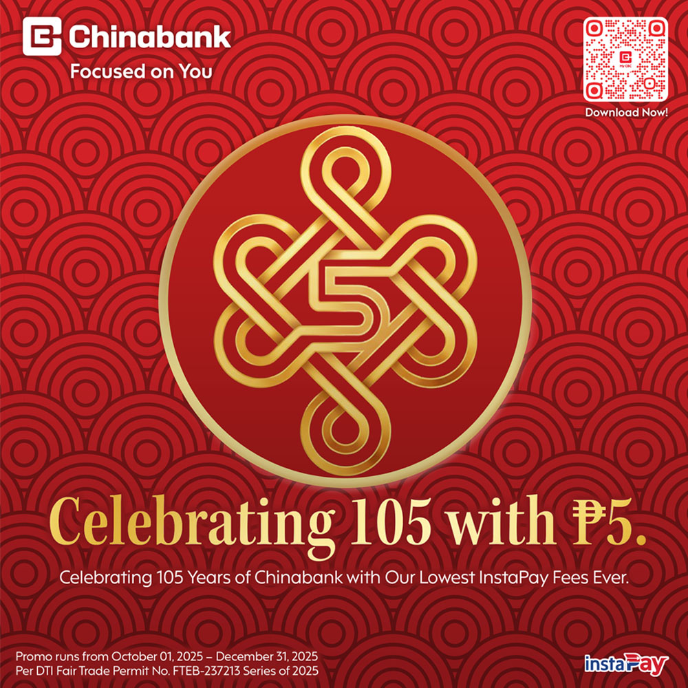 Read MoreAs part of its 105th anniversary celebration, Chinabank launched its new "Take 5 this 105" promo, a limited-time offer that reduces the InstaPay inter-bank transfer fee from an already industry best ₱10.00 to just ₱5.00. The promotion, which runs from October 1 to December 31, 2025, is available exclusively to Chinabank account holders enrolled in the My CBC app and My CBC Online.