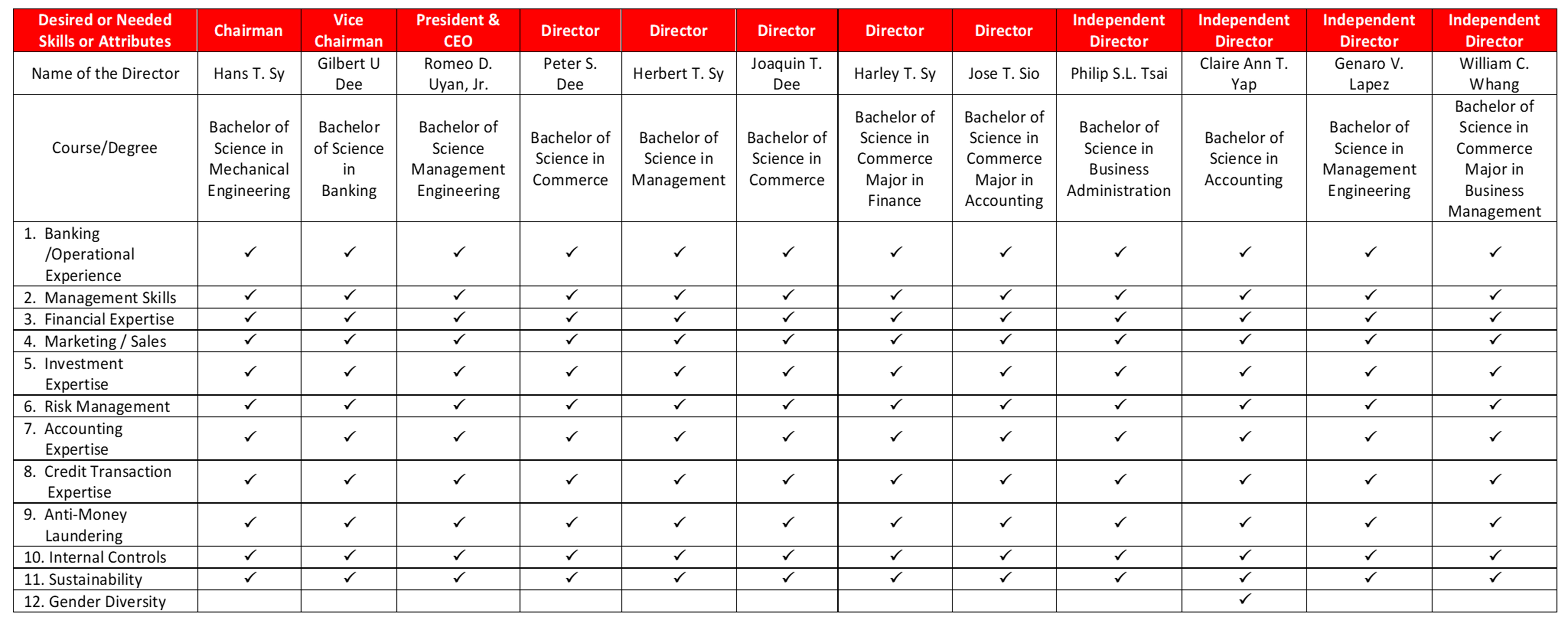 The table below summarizes the required skills and attributes in compliance with the diversity objectives.