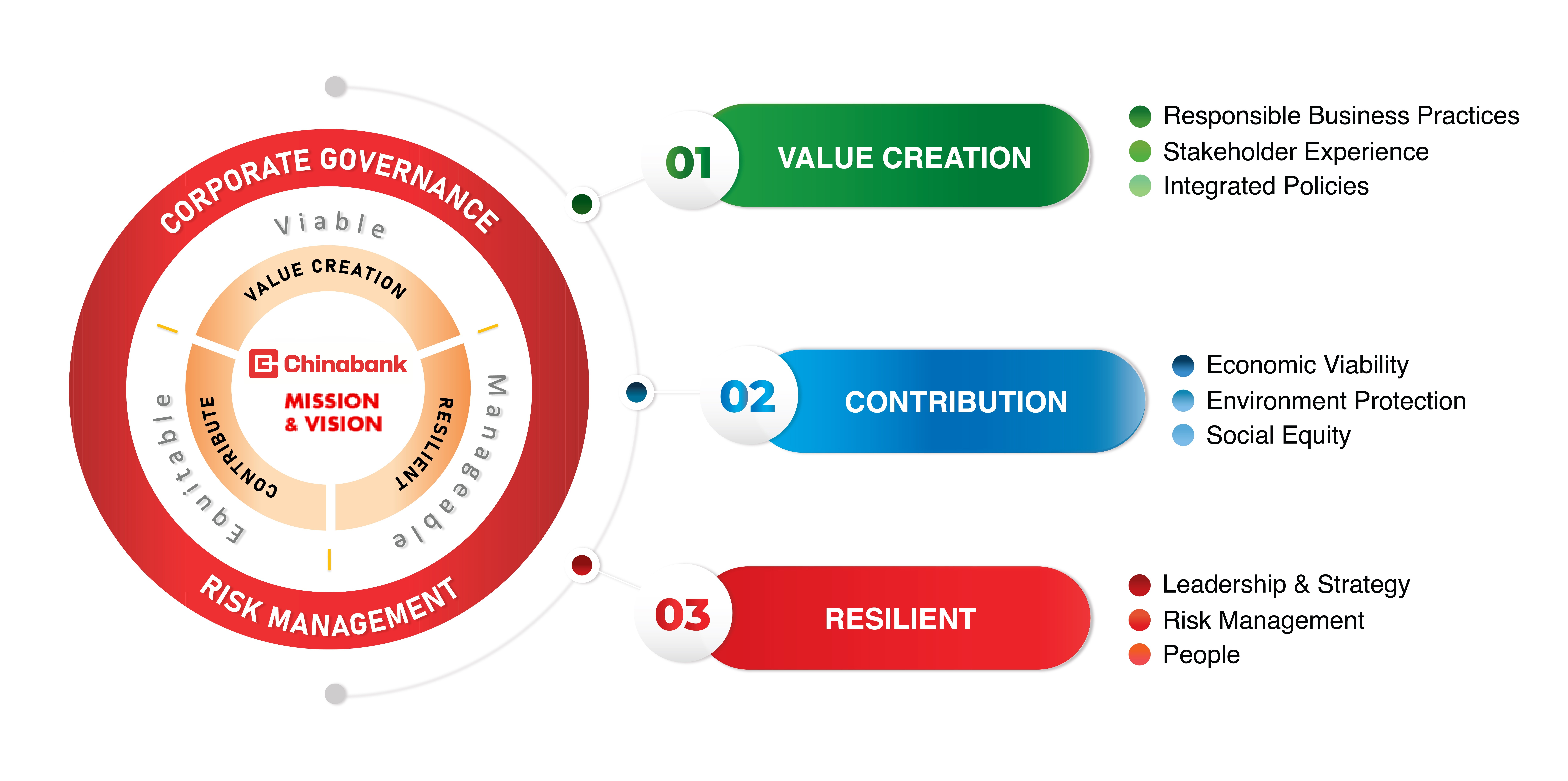Chinabank's Sustainability Strategy is to support its vision and mission through responsible Value Creation activities that Contribute to the environment and society, while being Resilient.