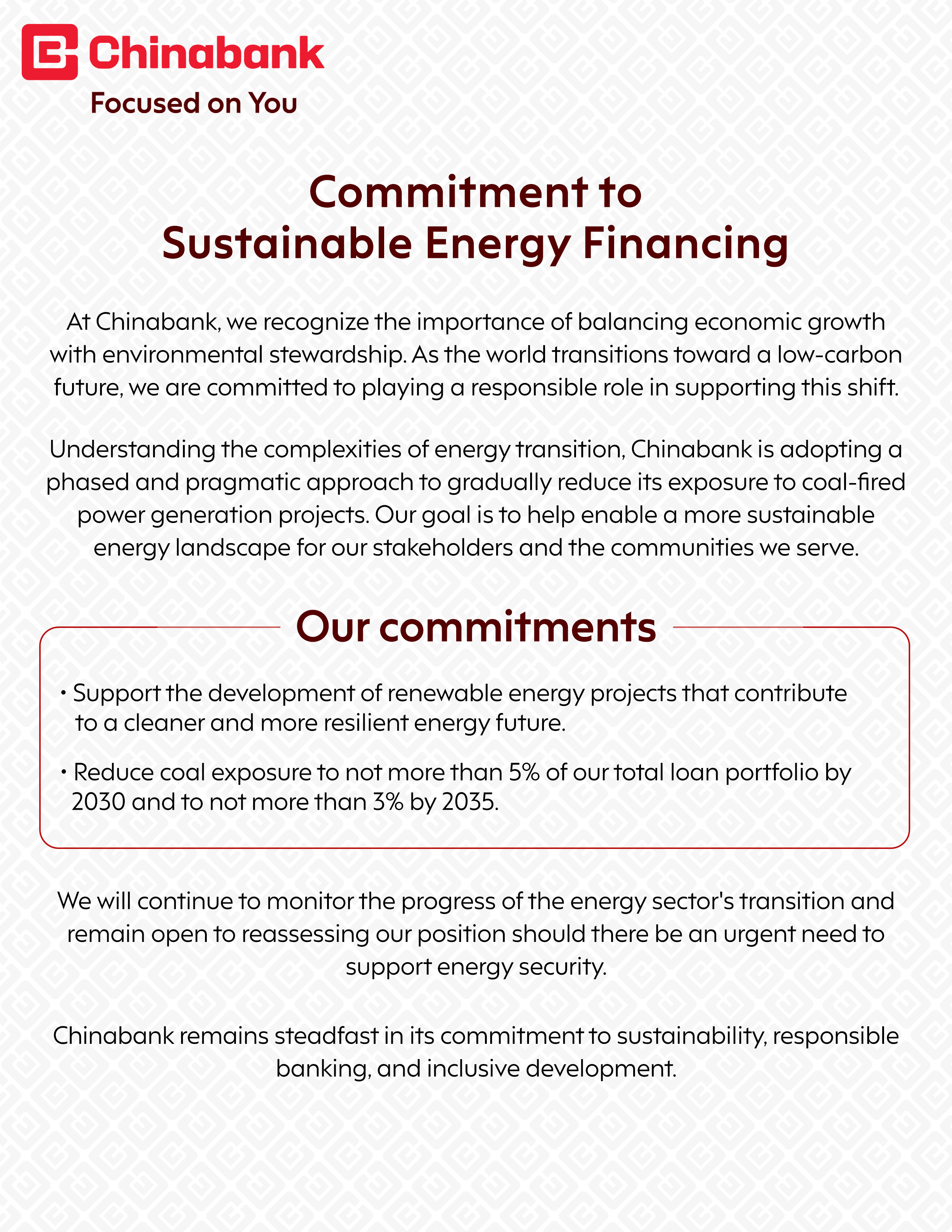 Placing a strong emphasis on transparency and accountability, Chinabank’s 2024 Annual Financial and Sustainability Report highlights the material financial and non-financial activities of the Chinabank Group for the period January 1 to December 31, 2024.
