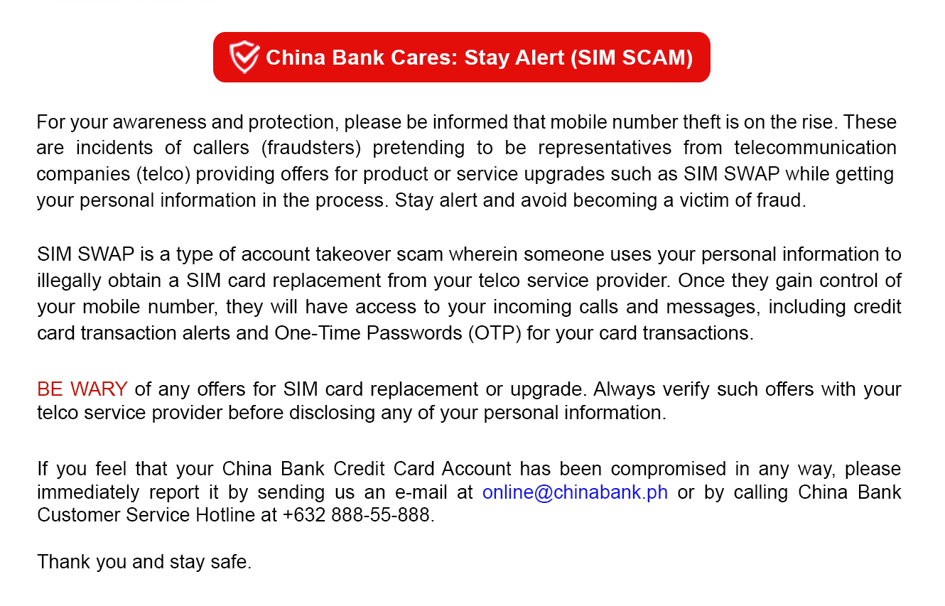 Submit your documents to creditcards@chinabank.ph or at any Chinabank branch near you. Please note that the processing of your application will take 10-15 banking days.