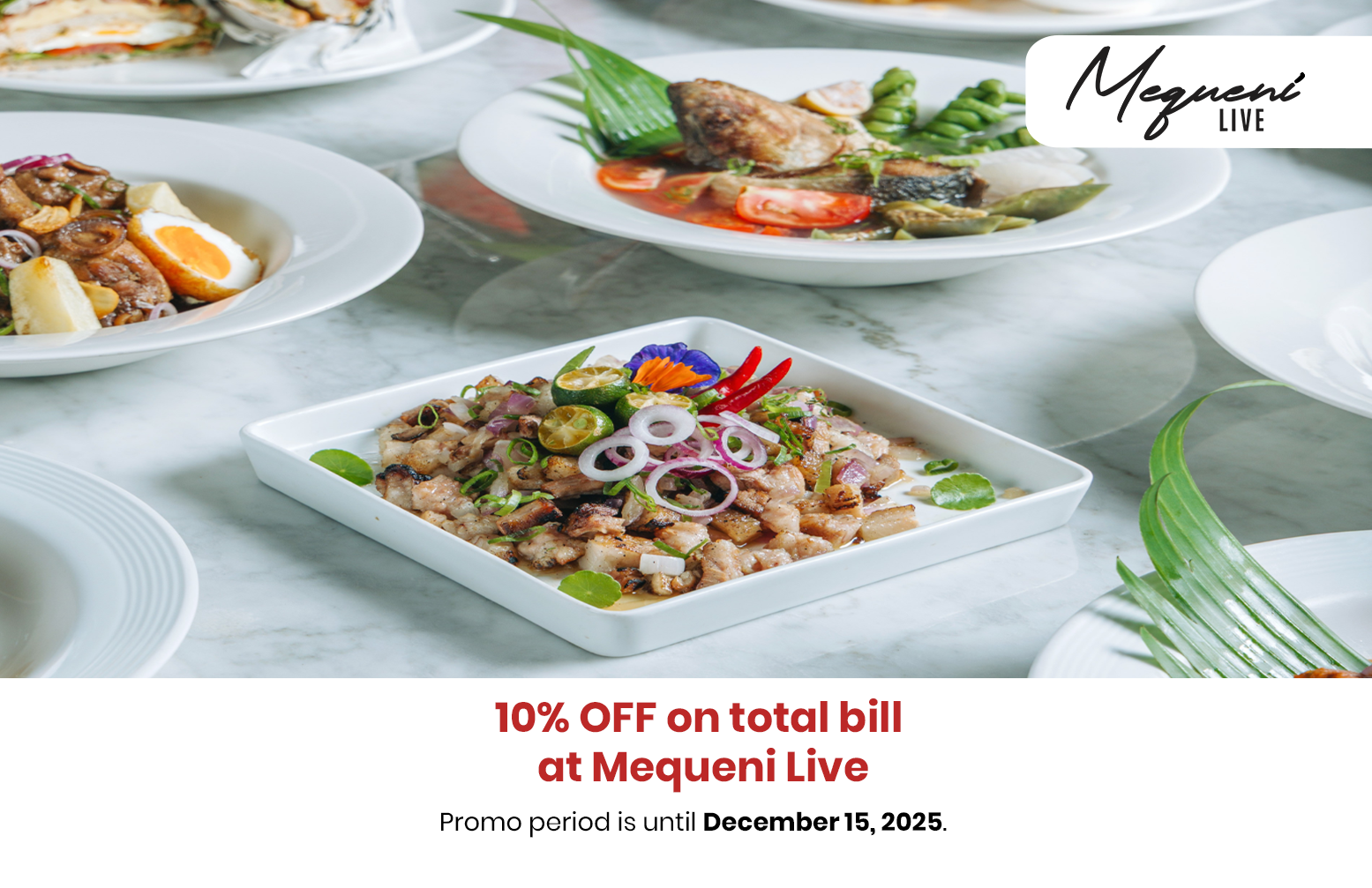 3. Cardholders are entitled to enjoy 10% OFF on total bill at Mequeni Live, Quest Plus Conference Center Clark when they use their Chinabank Credit or Debit Card (Chinabank Card) for payment.