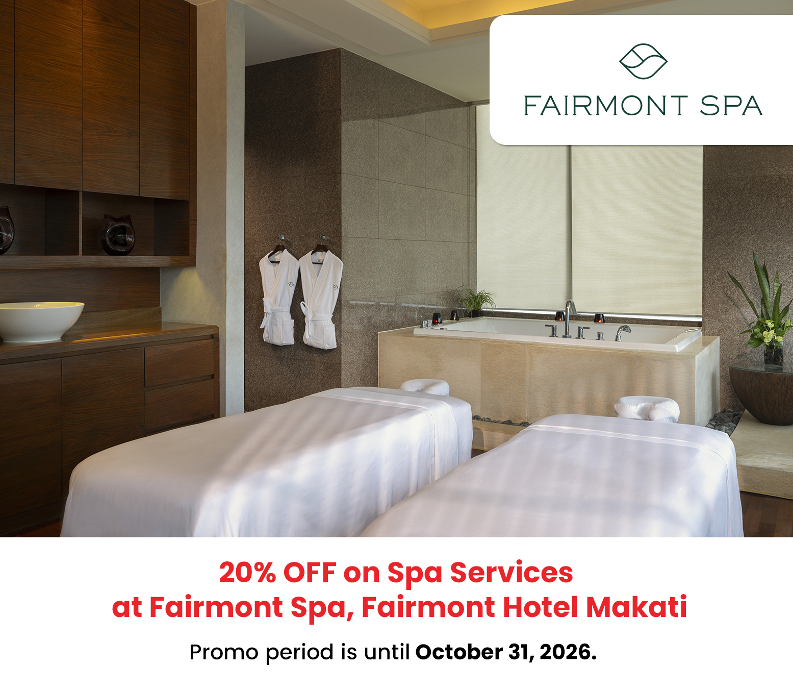 3. Cardholders are entitled to the following when they use their Chinabank Credit and Debit Card for payment at Fairmont Spa, Fairmont Hotel Makati.