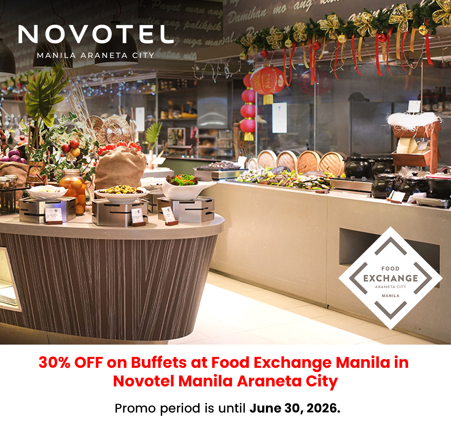 3. Cardholders are entitled to a 30% discount on Buffets (breakfast, lunch or dinner) at Food Exchange Manila in Novotel Manila Araneta City when they use their Chinabank Credit and Debit Card (“CBC Card”) for payment subject to the following conditions: