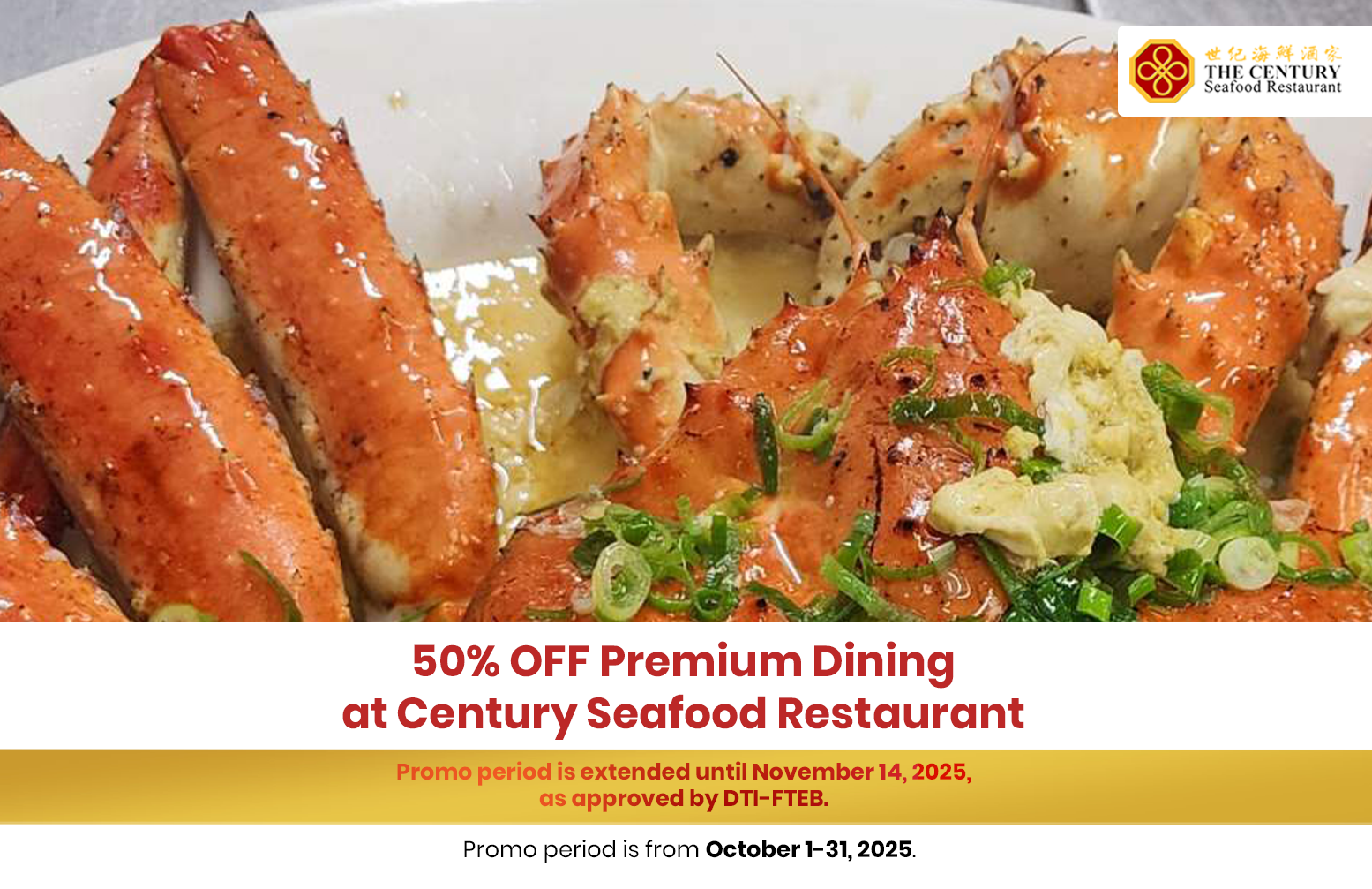 • Cardholders are entitled to a 50% discount on their Total Food Bill when they use their Chinabank World, Wealth, Platinum, Cash Rewards, and Freedom Credit Card (‘Credit Card”) for payment at The Century Seafood Restaurant, subject to the following conditions:
