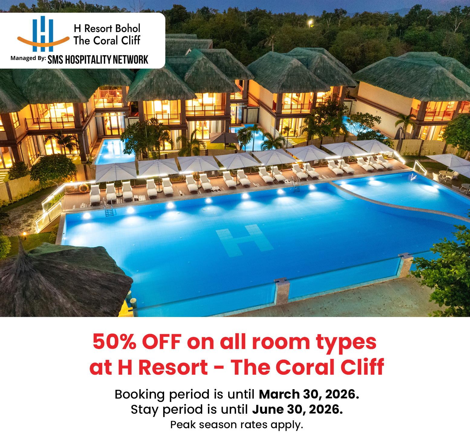 • For any inquiries or concerns regarding H Resort Bohol – The Coral Cliff’s services and discounts, please contact H Resort’s reservation team at (+63) 917 713 6174 or email rsvn@hresortbohol.com