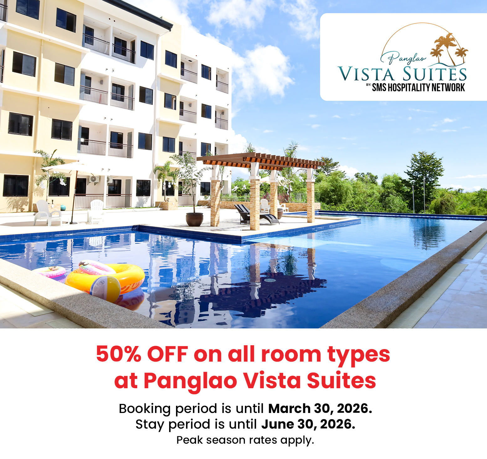 • For any inquiries or concerns regarding Panglao Vista Suites’ services and discounts, please contact Panglao Vista Suites’ Bohol reservation team at (+63) 956 917 6282 or email rsvn@panglaovista.com