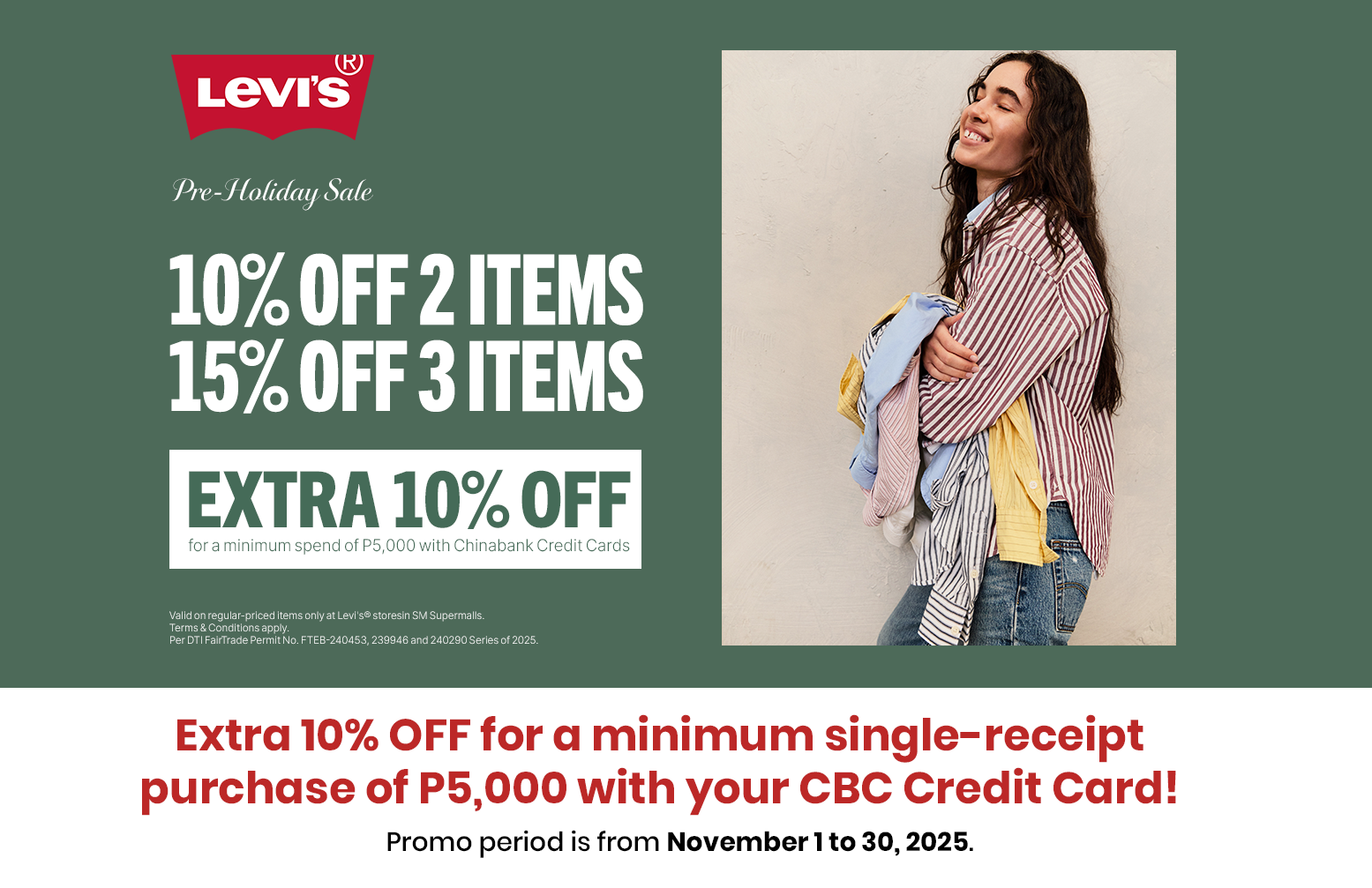 *Cardholders in good credit standing refers to accounts that are active and current and not blocked, delinquent or past due, not under any collections repayment program or special installment, not under investigation due to suspected fraudulent activities, or those whose Credit Cards are not reported lost or stolen, and those who have not otherwise, violated any of the Terms and Conditions Governing the Issuance and Use of the Chinabank Credit Cards.