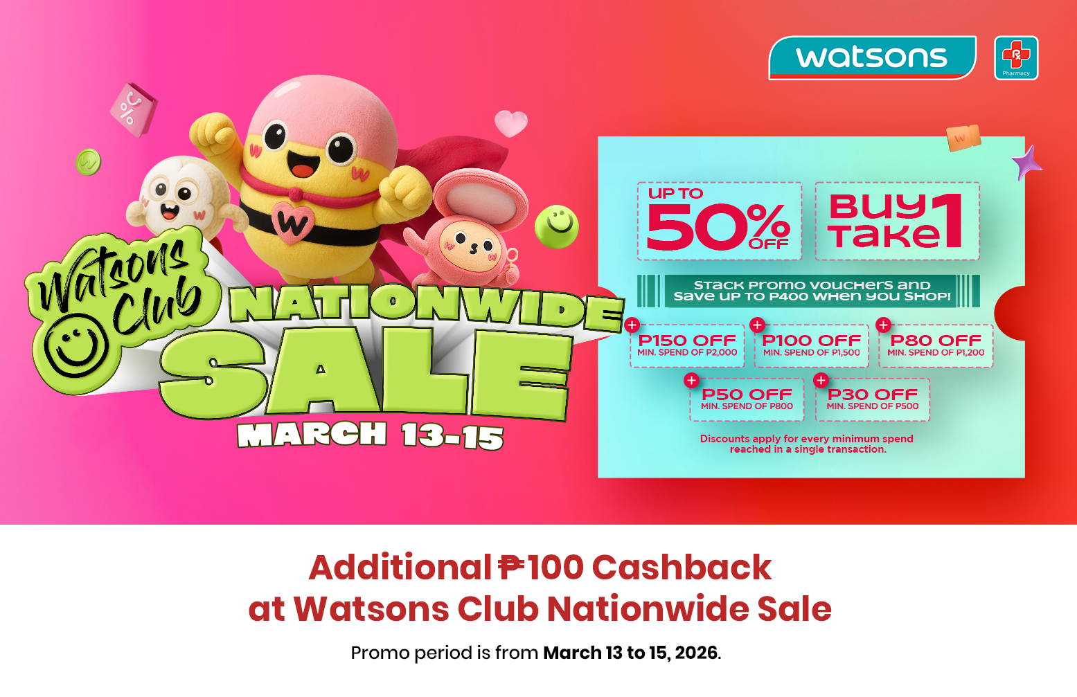 3. Cardholders are entitled to a ₱100 Cashback when they use their Chinabank Credit Card (‘Credit Card”) for payment at Watsons Club Nationwide Sale, subject to the following conditions: