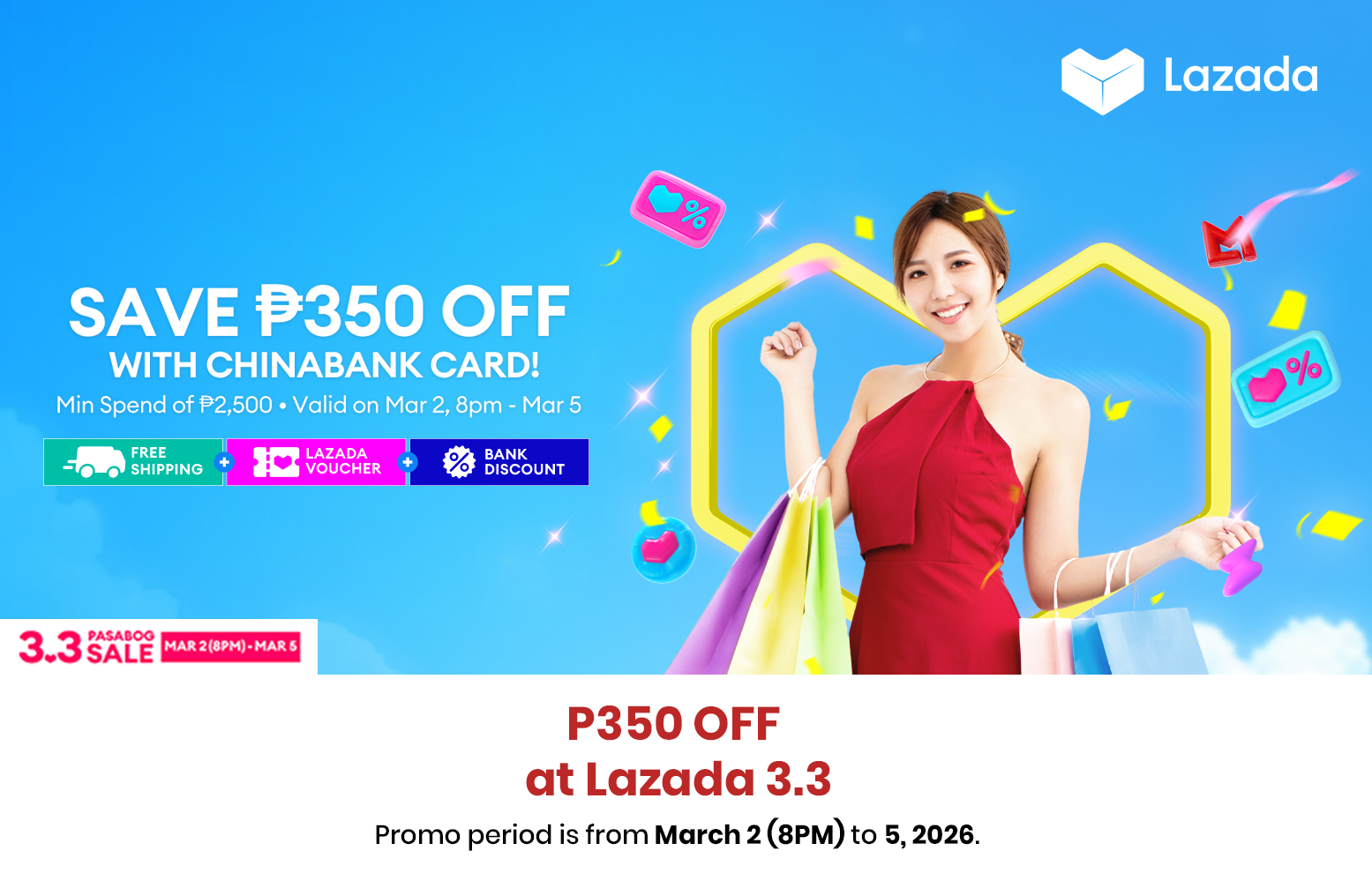 1. To qualify for the promo, the Cardholder must use an eligible Chinabank Credit or Debit Card for payment at Lazada.