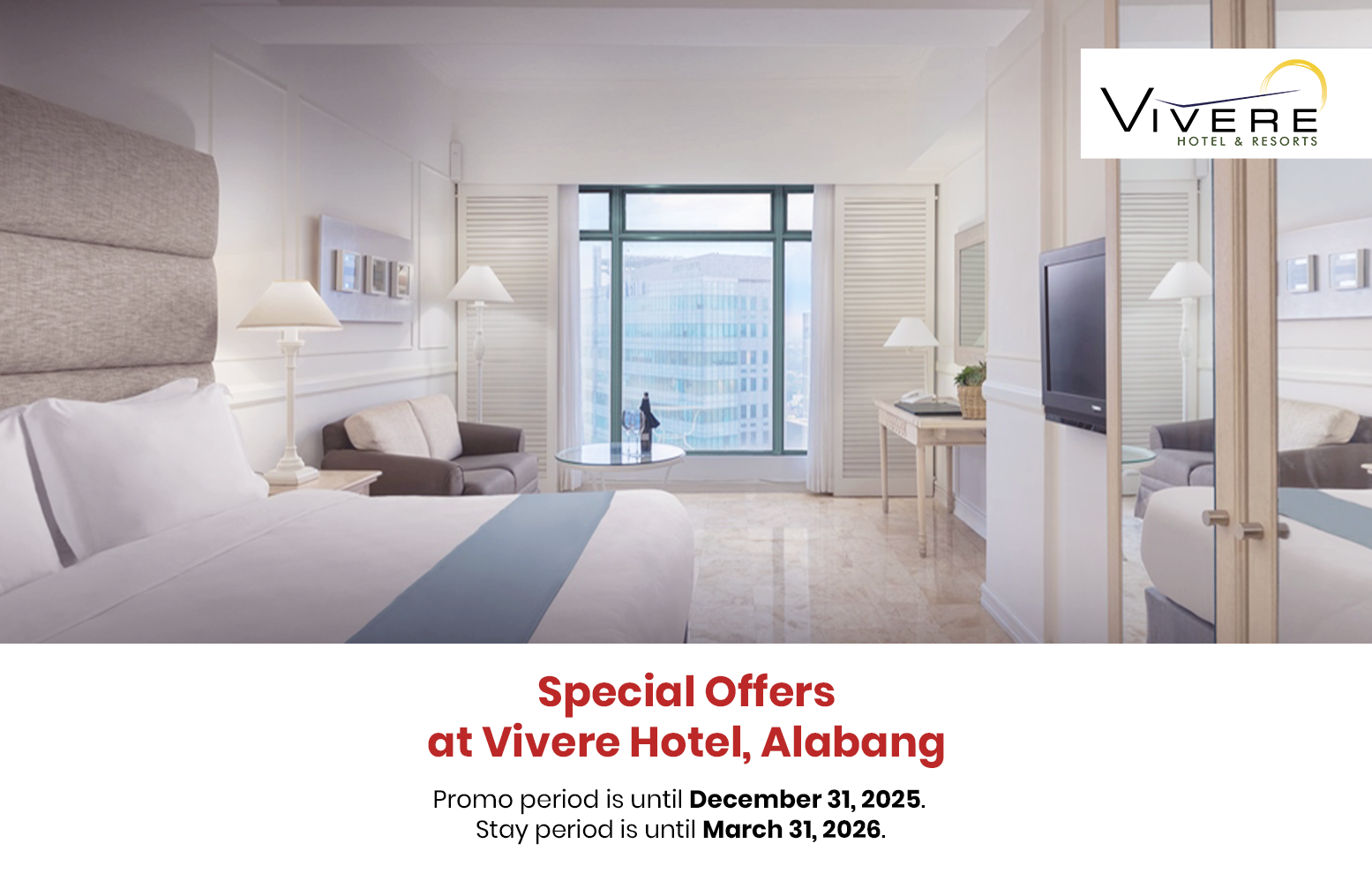 • Promo can be availed at: Vivere Hotel, 5102 Bridgeway Ave. Filinvest City, Alabang, Muntinlupa City.