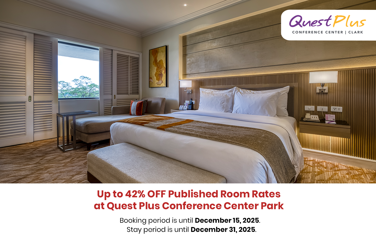 • Promo can be availed at: Quest Plus Conference Center Clark, Mimosa Drive, Filinvest Mimosa+ Leisure City, Clark Freeport Zone 2023 Pampanga, Philippines.
