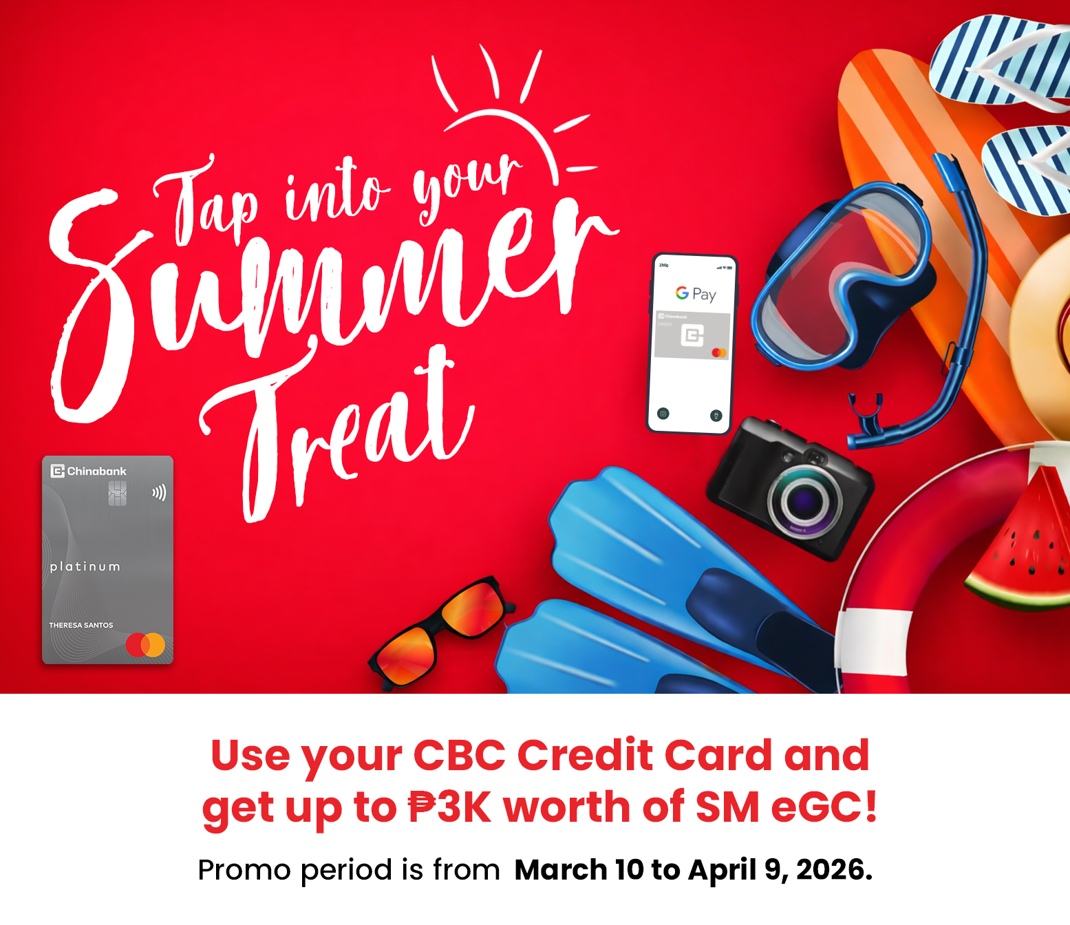4. Promo period is from March 10 to April 9, 2026. Qualified cardholder must use their Chinabank Credit Card and must have the following to get P1.5K worth of SM e-GC: